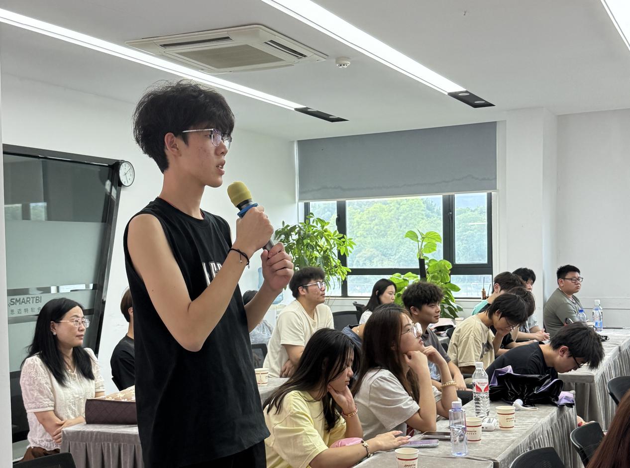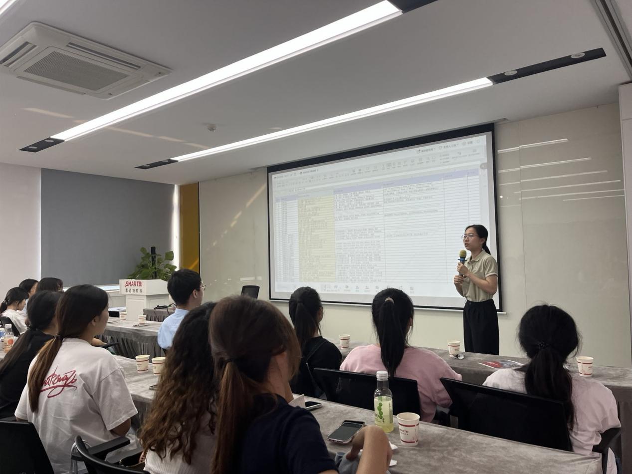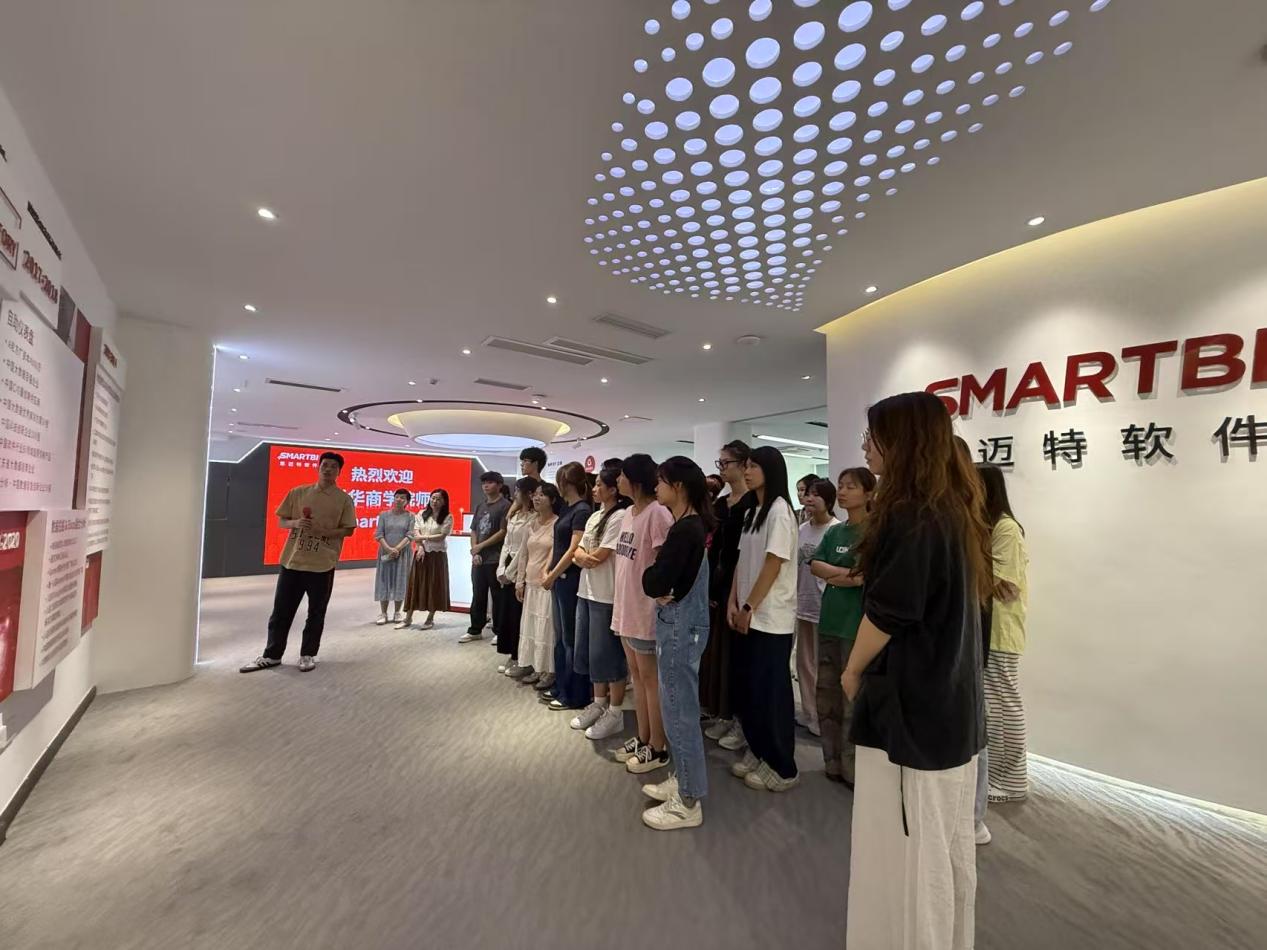 师生深入探访思迈特技术中心,企业售前顾问李晋铖为师生介绍企业自主研发的BI系统,该系统使用前沿技术整合数据可视化、自助式分析等核心模块来重塑数据分析生态,成功破解传统数据处理中的数据孤岛难题。他向师生现场演示系统实时抓取跨平台数据源,通过智能清洗构建标准化业务模型,最终生成可交互式大屏监控看板,即时调取智能报表,实现决策数据"指尖触达"。目前,解决方案已深度赋能金融风控、政务智治、高校科研等场景。李顾问强调,思迈特软件将持续迭代AI赋能的智能分析工具,帮助更多组织激活数据资产价值,推动产业数字化转型升级。