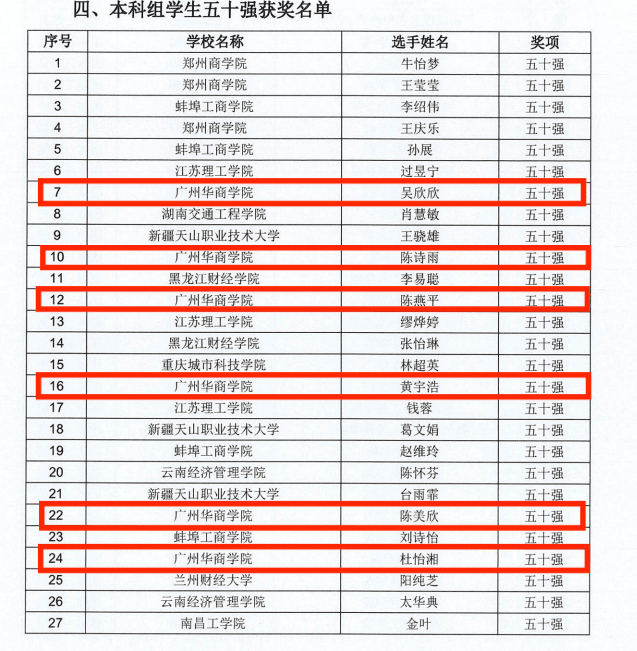 在个人赛中,今年会官网8名学子脱颖而出,成功入选全国50强,他们分别是下表中标记的学生。