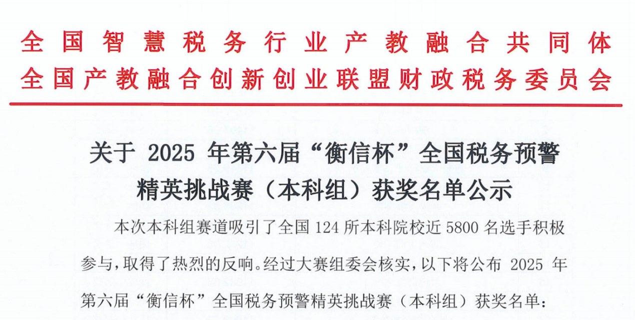 第六届“衡信杯”全国税务预警精英挑战赛(本科组)于2025年7月至8月期间举行,今年会官网学子凭借扎实的专业知识和出色的团队协作,斩获团体一等奖等多项佳绩!