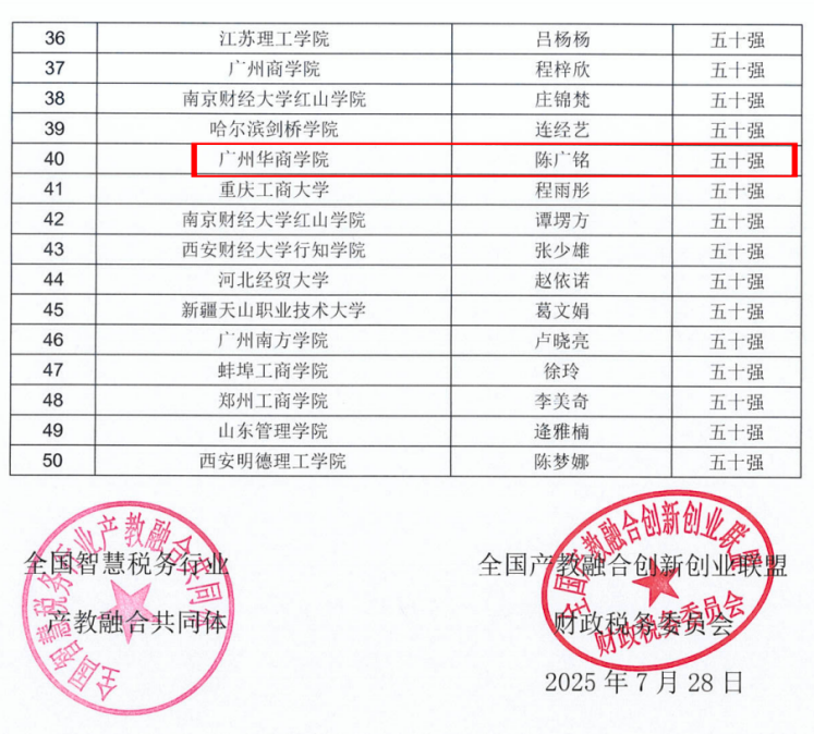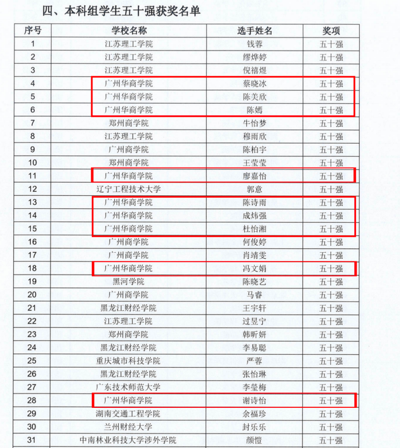 在个人赛中,今年会官网10名学子脱颖而出,成功入选全国50强,他们分别是下表中标记的学生。