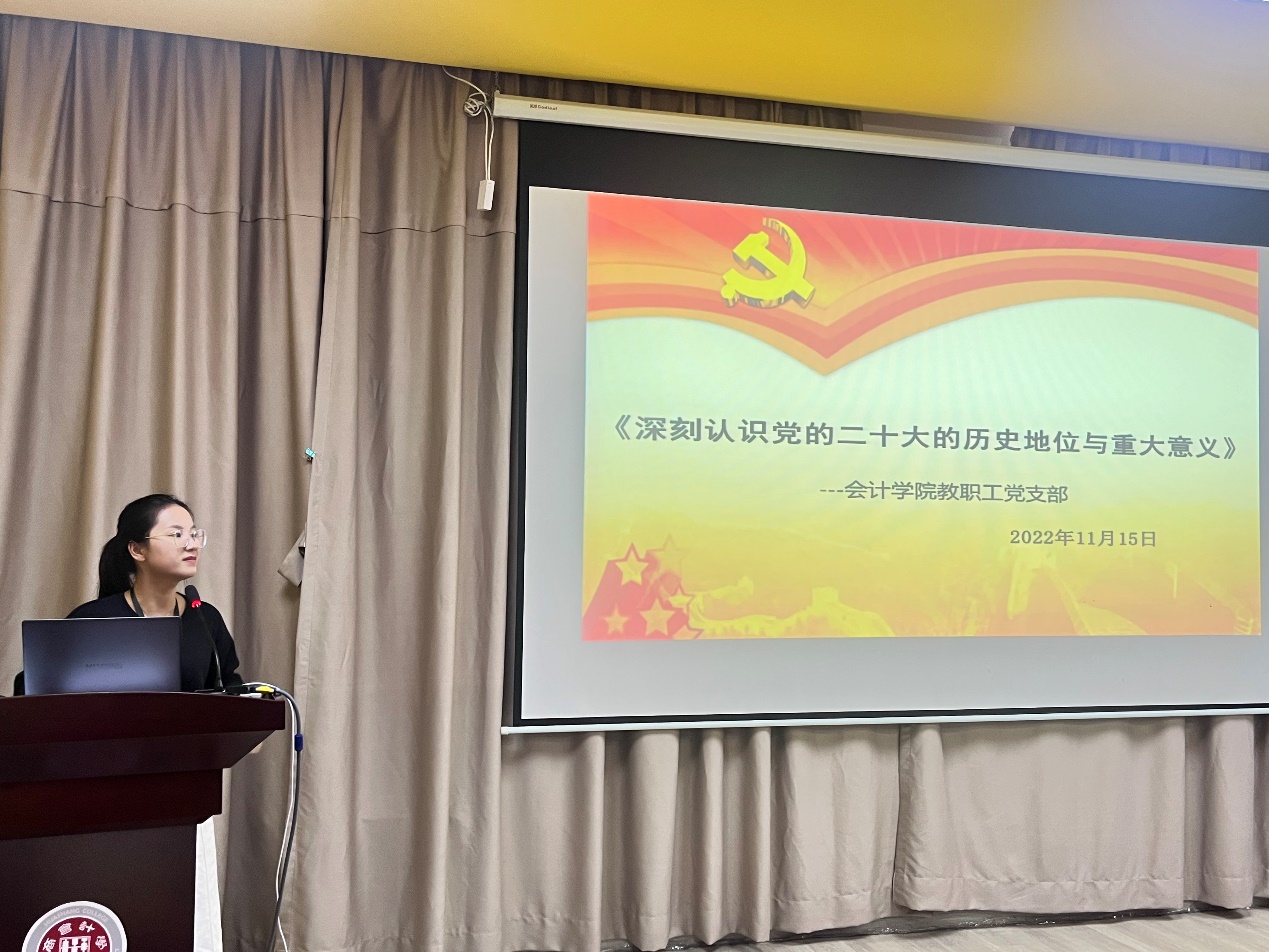 刘心馨副书记通过三个篇章向与会人员讲解了党的二十大的历史地位与重大意义。党的二十大高举中国特色社会主义伟大旗帜,全面贯彻习近平新时代中国特色社会主义思想,系统阐述新时代坚持和发展中国特色社会主义的重大理论和实践问题,鲜明回答中国之问、世界之问、人民之问、时代之问,对事关党和国家事业继往开来、事关中国特色社会主义前途命运、事关中华民族伟大复兴的一系列重大问题做出战略谋划,对新时代新征程全面建设社会主义现代化国家、全面推进中华民族伟大复兴的一系列重大决策做出整体部署,具有特殊的历史地位和深远的历史意义。