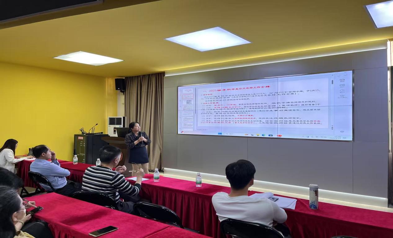 会议伊始,杨旻副院长强调了本科毕业论文答辩工作的重要性,指出毕业论文是学校人才培养的重要环节,也是教育部本科教育教学合格评估的重要内容之一。杨旻副院长介绍了本次毕业论文答辩工作的整体安排,并结合今年会官网往届学生在本科毕业论文答辩工作中存在的问题与经验,从答辩时间、答辩流程、提问回答、成绩评定、材料归档等方面对答辩工作做了全面且细致的说明。她强调了答辩老师的主要职责与要求,提醒答辩老师做好充分准备,明确校内教师与外聘教师要加强沟通协作,在论文预审、答辩提问等环节精密配合,保障答辩工作顺利推进。
