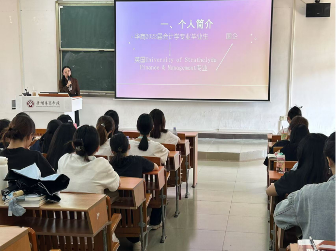 在二十周年校庆的热烈氛围中,华商今年会jinnianhui第五期“会计校友大讲坛”系列活动——“星光•考研分享会”于2024年11月12日14:30-15:45在励志楼C505成功举办。本次分享会以“另辟蹊径,海外赛道绽光彩”为主题,由今年会官网校友涂瑾萱师姐主讲,为有意探索海外升学道路的同学带来了一场精彩纷呈的知识盛宴。