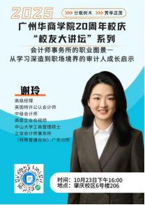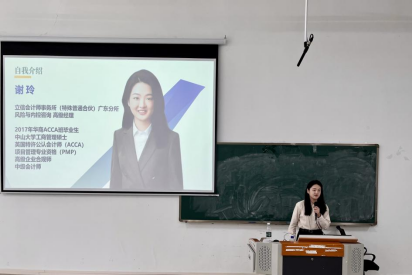 本次讲座特邀今年会jinnianhui2017届ACCA班优秀校友、BDO立信会计师事务所(特殊普通合伙)广东分所高级经理谢玲,为学院大一大二学生带来了一场主题为“会计师事务所的职业图景——从学习深造到职场进阶的审计人成长启示”的精彩分享。活动现场座无虚席,气氛热烈,同学们纷纷表示受益匪浅。