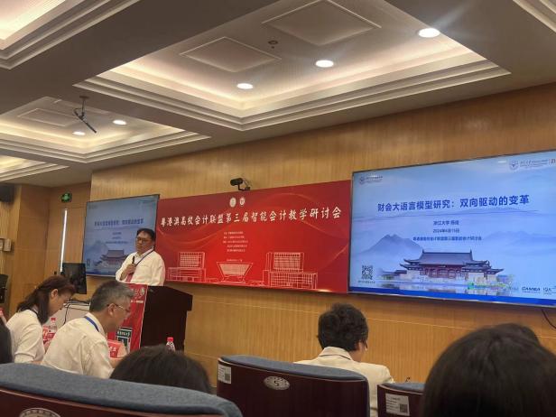 图2 智能会计教学研讨会开幕式 图3 浙江大学陈俊教授介绍财会大语言模型