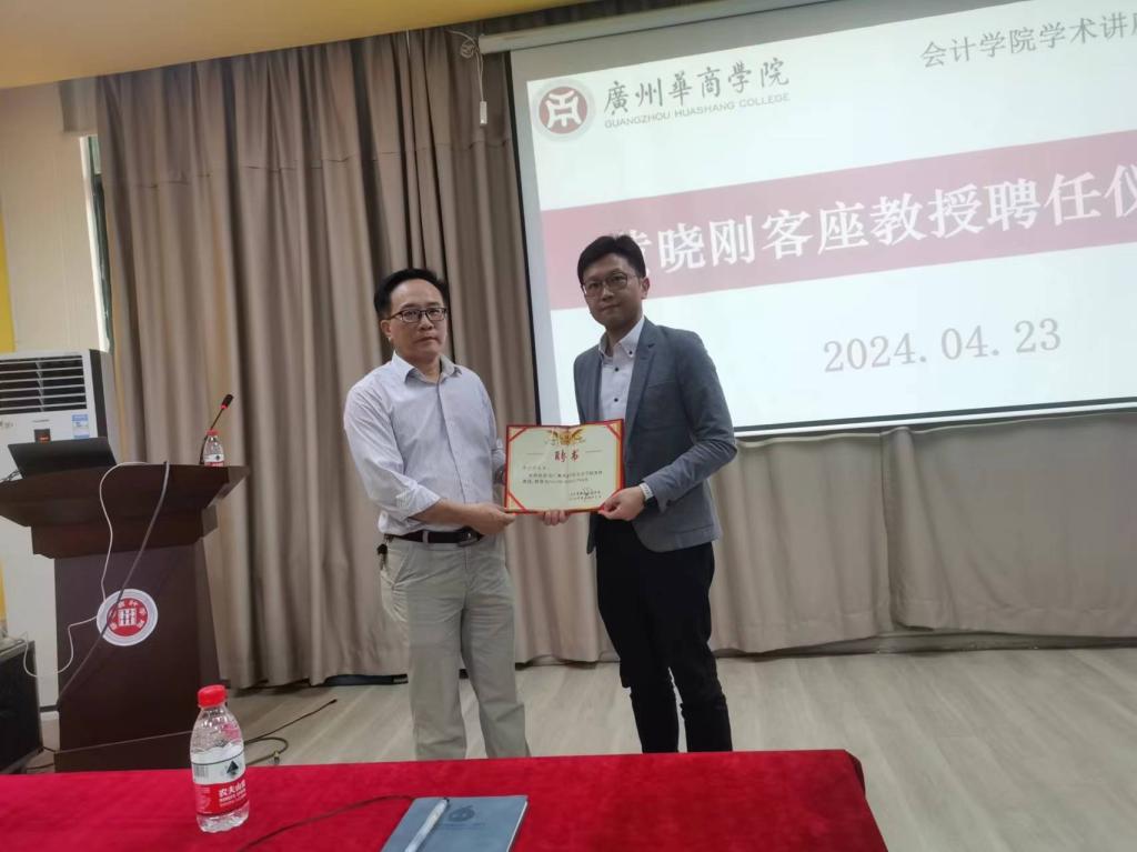 讲座开始前,学院举行了客座教授聘任仪式,今年会官网聘任黄晓刚先生为学院客座教授,副院长刘善球向黄晓刚颁发了客座教授聘书。