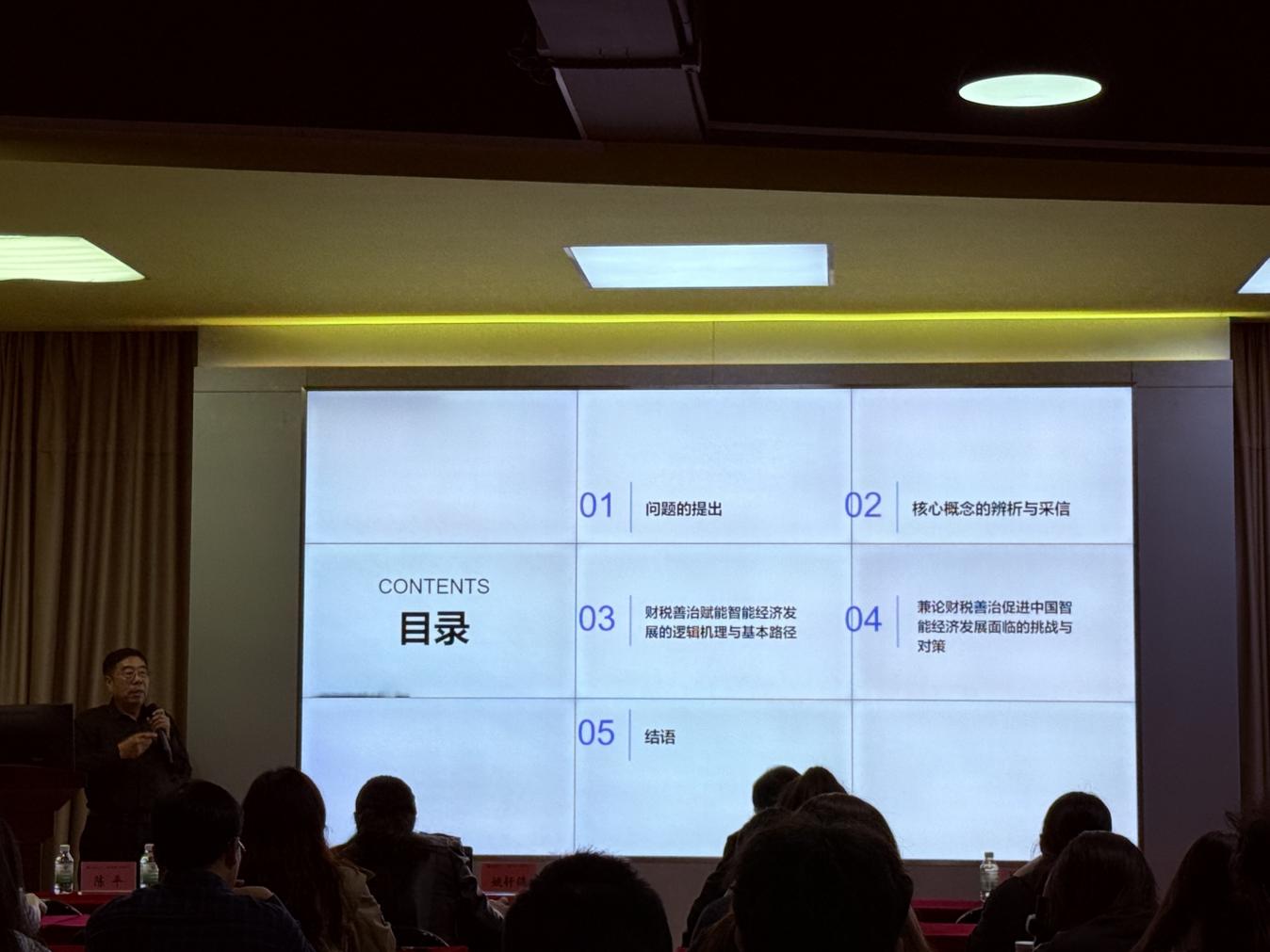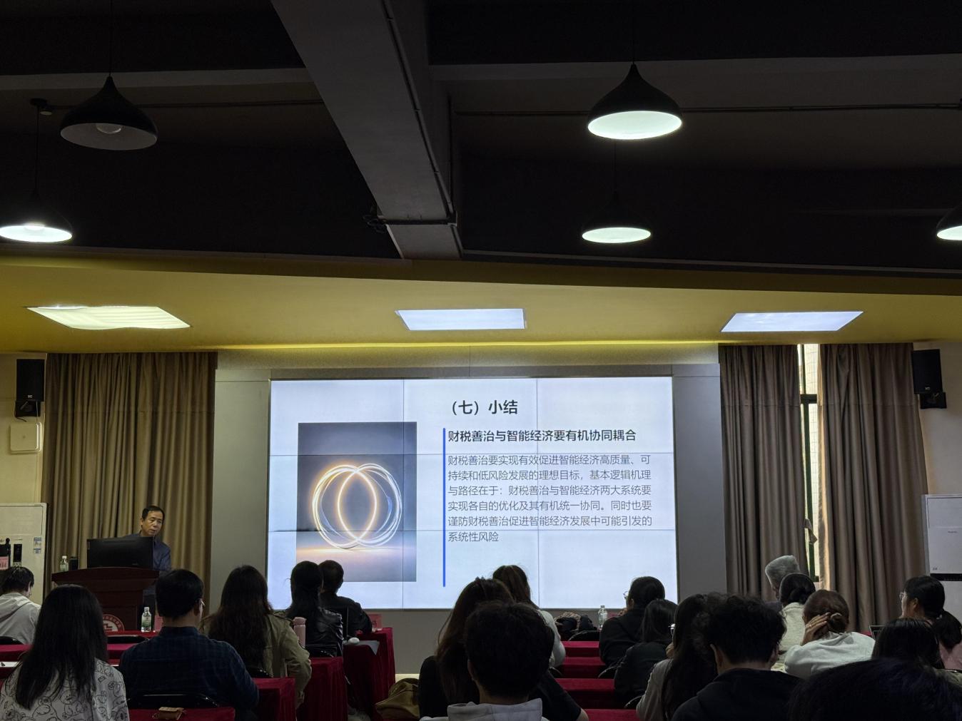 姚凤民院长在总结中对姚轩鸽教授的精彩分享表示感谢。他表示,姚教授的讲座立足时代前沿,既系统解析了财税善治与智能经济的协同逻辑,也为学院人才培养提供了重要启示。学院将充分吸收讲座成果,进一步推进数智融合课程建设,将财税善治、智能经济相关前沿内容融入教学体系,强化学生的系统思维与实践能力,培养更多适应数字经济时代需求的高素质应用型财税人才。