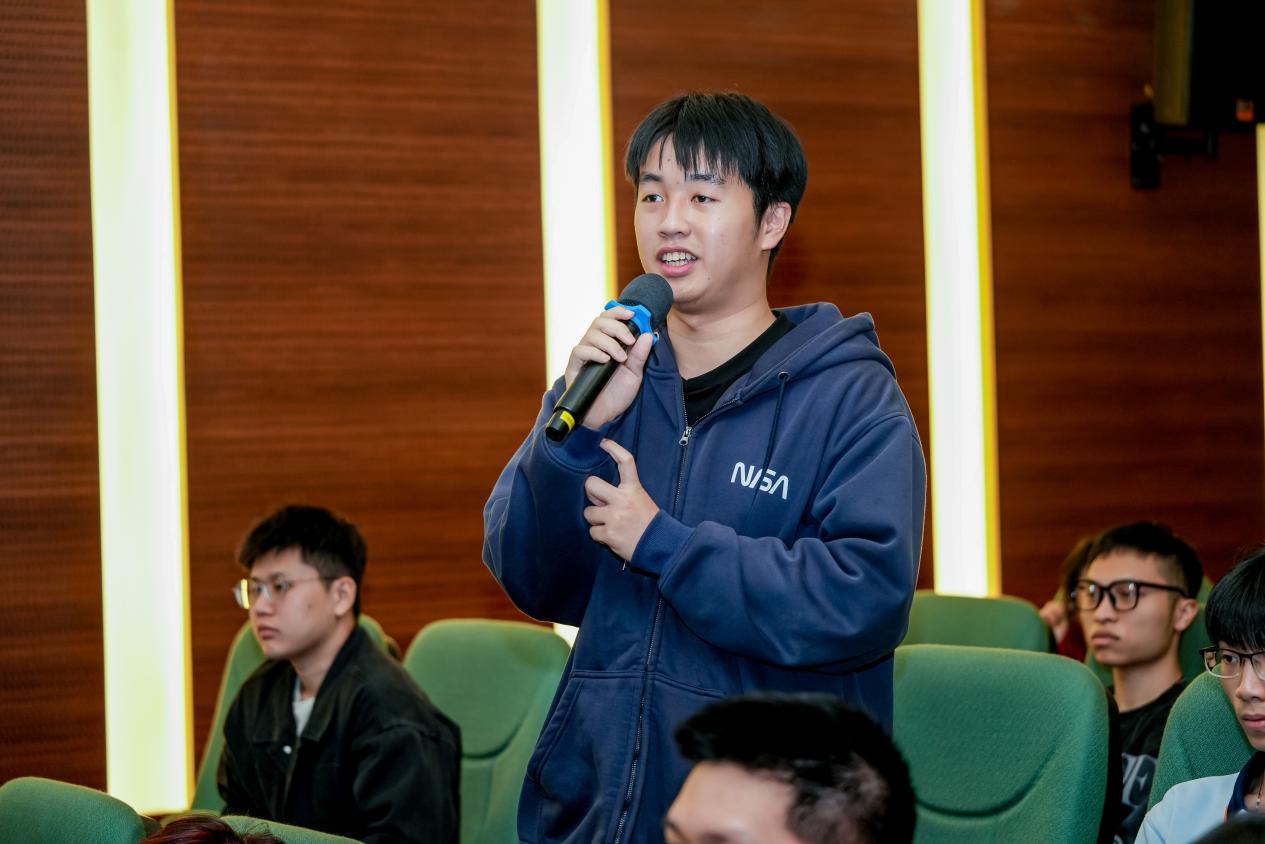 现场学生踊跃提问:“即将毕业,有些迷茫,是选择留在广州发展还是回老家发展呢?”“如何接触AI,开通学习AI的新通道呢?”针对同学们的提问,三位企业家结合自身实践,金句频出,为青年学子指明方向。