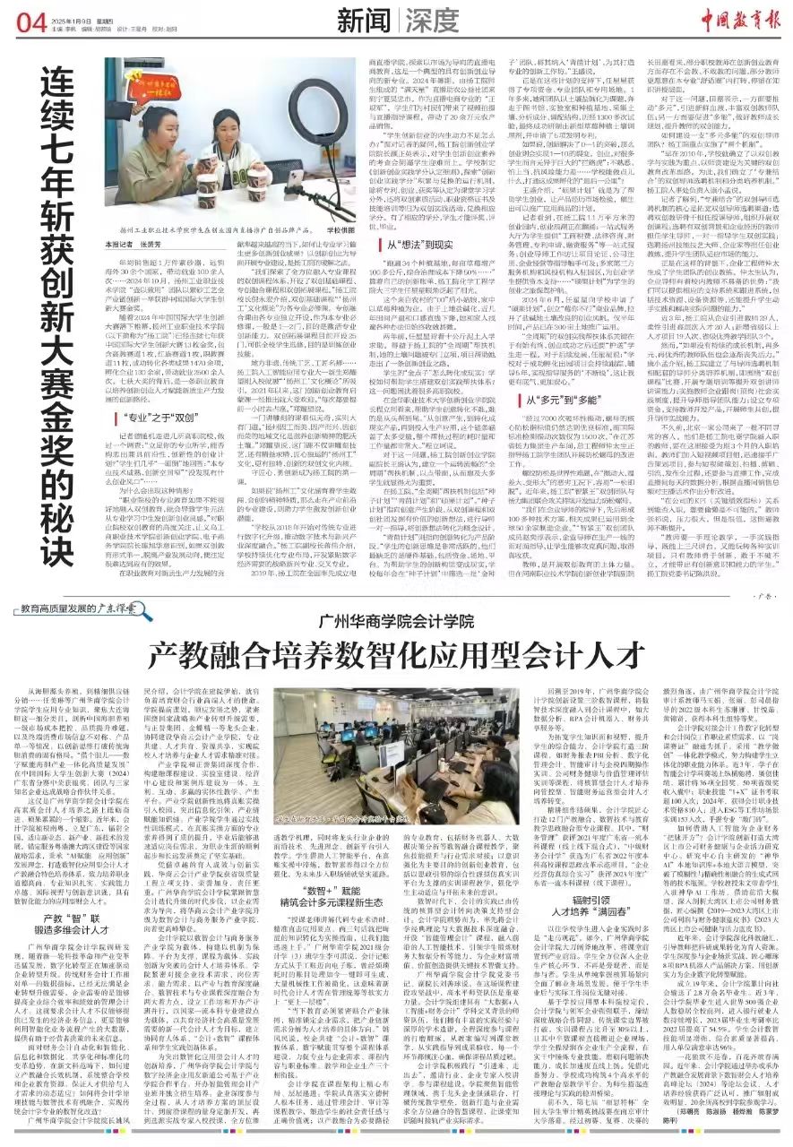 《中国教育报》对学院产教融合的数智化会计人才培养成果进行专刊报道,充分体现学院在人才培养方面的创新实践和卓越成效获得广泛认可。专刊从人才培养模式创新、课程体系建设、实践教学改革、校企合作成果等多个角度深入报道,展示学院在推动数智化会计人才培养方面的积极探索和成功经验,不仅为学院树立良好社会形象,也为其他高校在财经教育领域改革发展提供了有益借鉴。