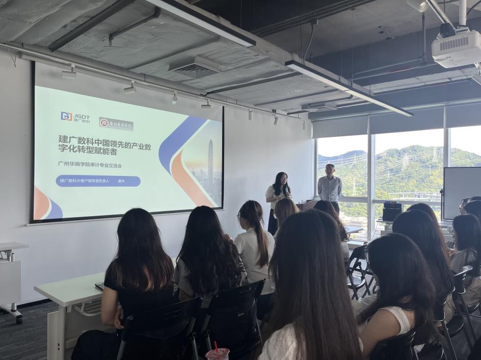 随后,建广数科多位业务骨干带来三场干货满满的主题分享,为同学们打开了数字化审计的实践窗口。首先大客户服务部负责人黄仲以《建广数科中国领先的产业数字化转型赋能者》为题,解析了企业在数字化转型领域的核心技术与全链条服务能力,结合服务制造、金融等行业的标杆案例,展示如何通过数字化工具破解企业运营痛点,让同学们对产业数字化转型的实际价值有了更深入的理解。